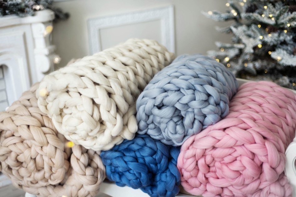 Как связать плед, одеяло, покрывало из толстой пряжи, шерсти альпака и мериноса, крупной объемной вязки на руках без спиц и крючка: пошаговая инструкция