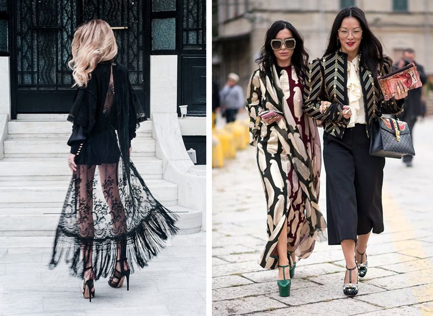 Способность грамотно сочетать разные принты в одном образе — умение, которое можно натренировать. Например, может помочь наша статья, рассказывающая о главных правилах сочетаний. Усилия того стоят: посмотрите, как великолепно выглядят эти комплекты, где к кимоно с узором подобрана вещь с гармоничным принтом.
