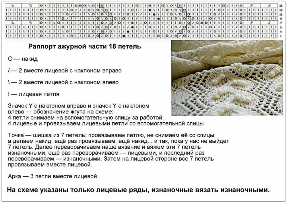 Начните с 1 кромочн. п. перед раппортом, затем чередуйте рисунок из раппорта, закончите пет. после раппорта и 1 кромочн. Примечание работе с ажурной каймой: провязывайте на 18 п. по сх. 2. Обозначены лиц. и изнан. р., включая кром. Число петель в рядах меняется.