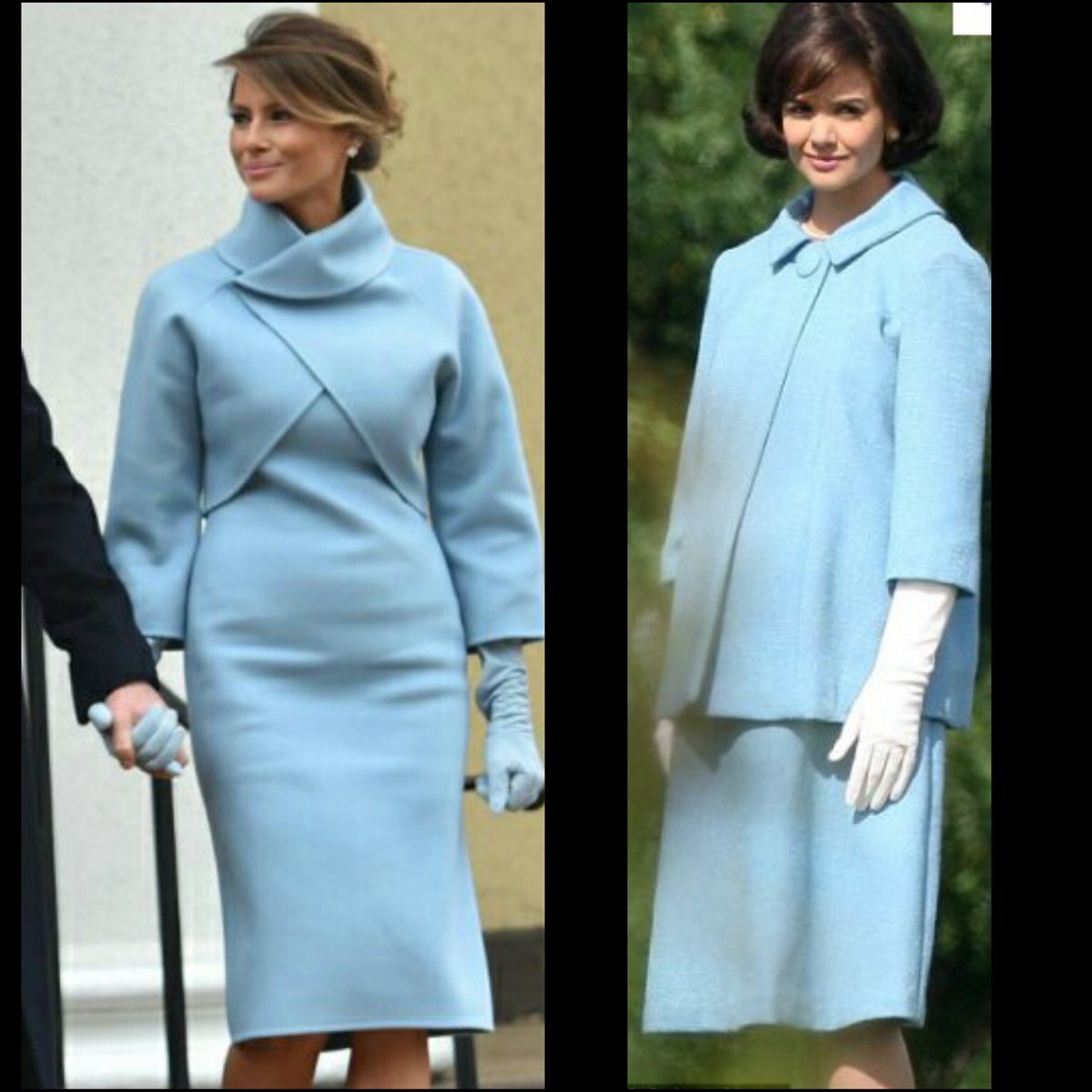 Часто читаю, что на этот голубой наряд Меланию вдохновил образ Джеки Кеннеди. Прямого цитирования не вижу, да и в целом мало общего, на мой взгляд, кроме высоких перчаток и едва уловимого оттенка. И это меня смутило.