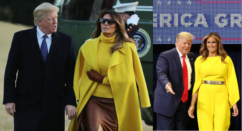 У Мелании особое отношение с желтым цветом. Несмотря на то, что это довольно-таки сложный цвет, особенно, для политических всяких мероприятий. Коннотации желтого цвета – это оптимизм, жизнерадостность, не агрессивная (в отличие от красного) энергичность. Пишу это и думаю: а че им не нравится-то? Почему политик обязательно должен быть скучным и нудным? А, ну ладно. Хотелось бы, чтобы ядерный чемоданчик был в руках скучного и нудного человека ахаха. Но когда ты жена политика у тебя гораздо больше места для маневра, чем прекрасно и пользовалась Мелания.