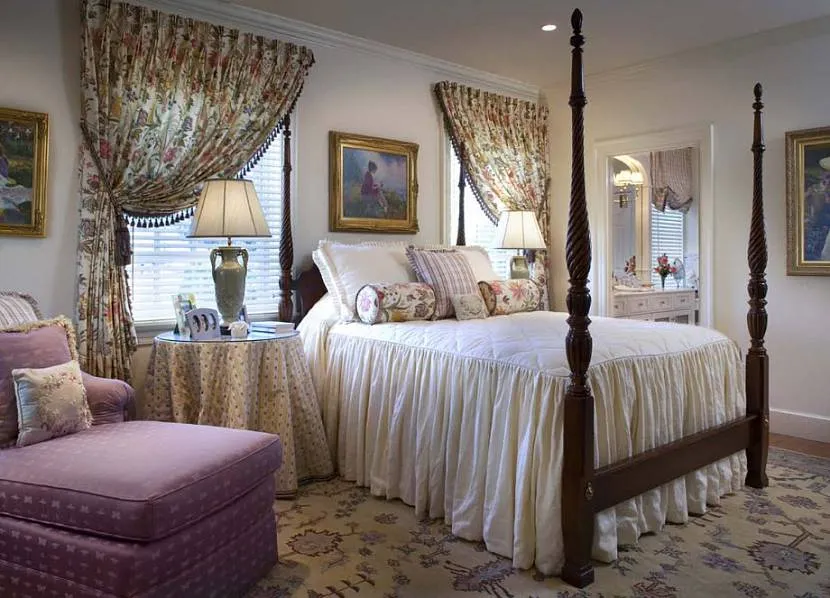 Актуальны модели для спальни в стиле винтаж, шебби-шик или прованс. Роскошно в интерьере будут смотреться белоснежные кружевные узоры, вышивка и бахрома. Даже вязаное старое покрывало наполнит комнату нотками домашнего уюта и теплоты.