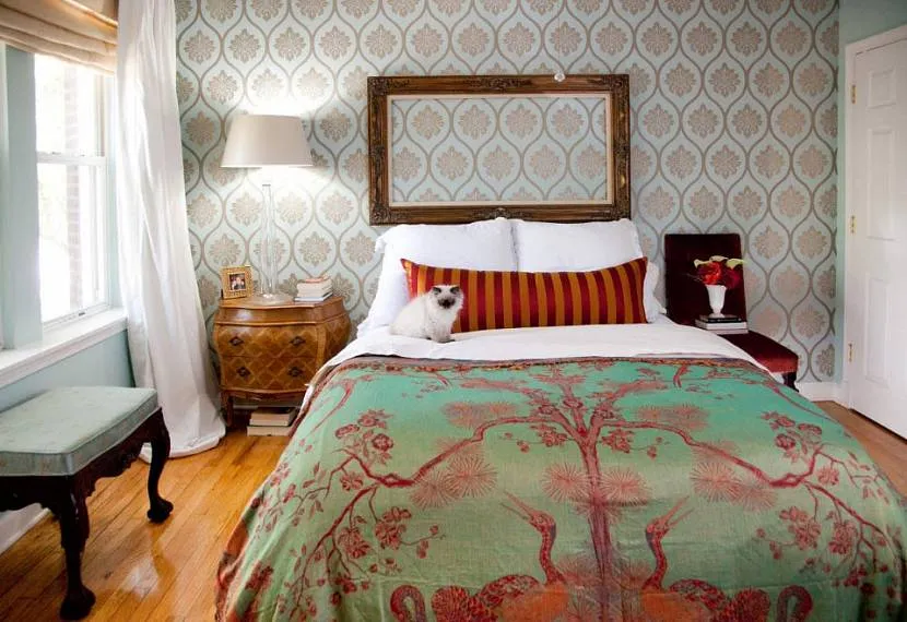 Цвет покрывала можно сочетать с расцветкой обоев. Оформляя помещение обоями с принтом, можно сделать рисунок основным фоном для текстиля. Таким образом можно получить гармоничный и оригинальный интерьер.