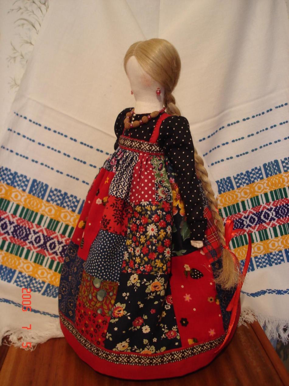 Еще в качестве материала можно использовать голову, туловище и ручки старой куклы. Платье, сшитое из вафельной ткани, лент, ситцевых вставок, должно быть по размеру вашей кукле.