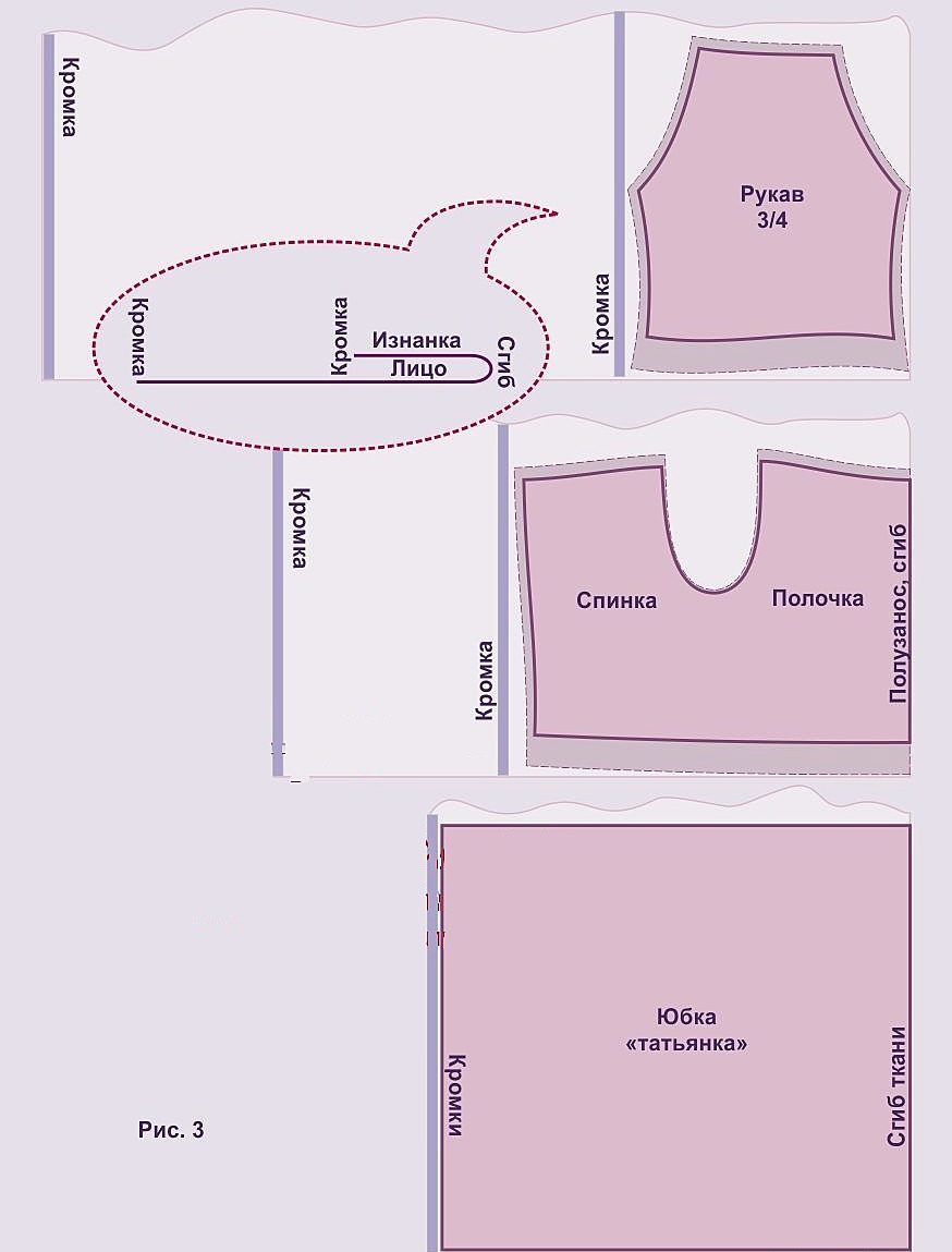 - Всего должно получиться пять частей: два рукава, две детали юбки и одна часть со сгибом спинки и полочки.