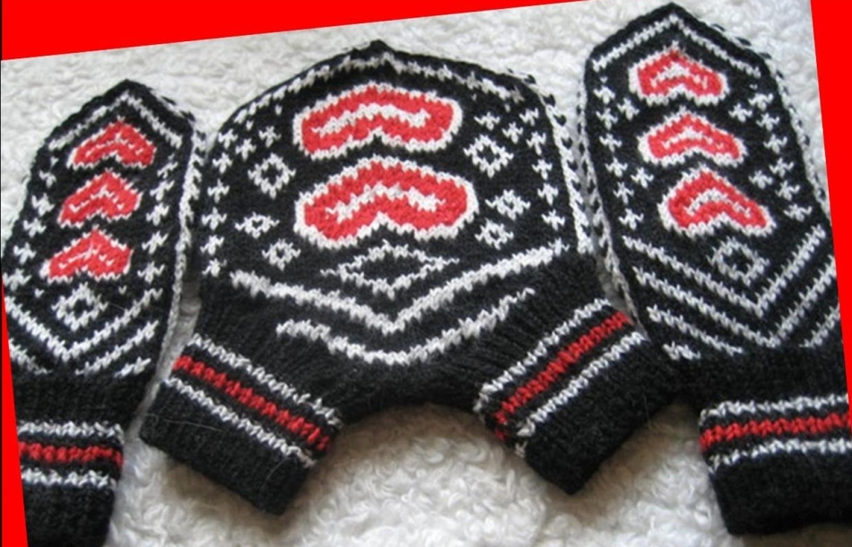 - Вязание на двух спицах. Он включает в себя вязание одной ткани, которая затем сшивается. Обычно таким способом изготавливают варежки со сложным орнаментом или жаккардом. Когда другие методы становятся трудными для использования.