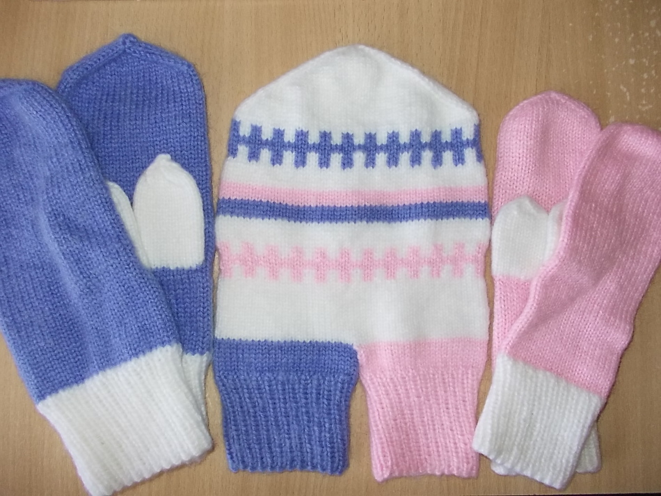 При изготовлении детских варежек на двух спицах на инструмент набирается необходимое количество петель (исходя из желаемого размера). Провязывается резинка, порядка 15 рядов. Затем следует узор до начальной точки большого пальца. При этом в заключительном ряду петли, по количеству равные половине объема пальца, следует провязать нитью контрастного цвета. После переместить их на вторую спицу и провязать основной нитью.