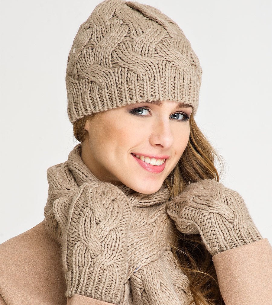 Комплект — шапка, снуд и варежки спицами с интересным узором: фото моделей