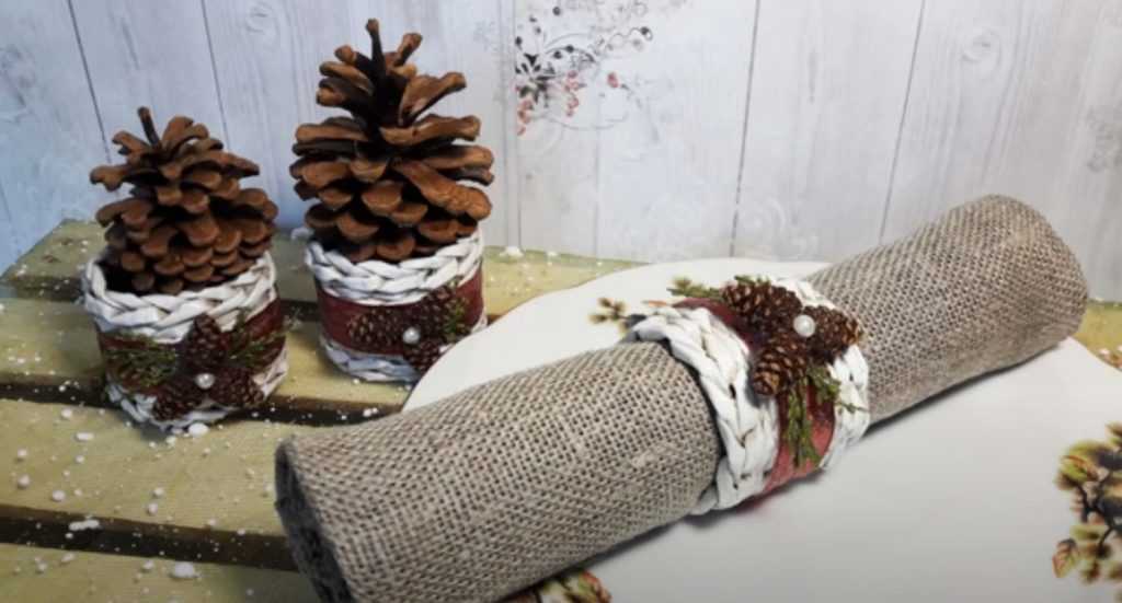 Основная работа приходится на плетение колец из бумажных трубочек. Можно выбрать тонкие или средние трубочки подходящего цвета. Взяв цилиндрическую форму за основу, необходимо наложить на неё путём плетения необходимый по высоте браслет. Покрыв его клеем, нанести по центру цветную ленту и разместить на ней шишки и веточки. Предварительные работы займут время – это изготовление трубочек, а также необходимо заранее приготовить собранные шишки и веточки.