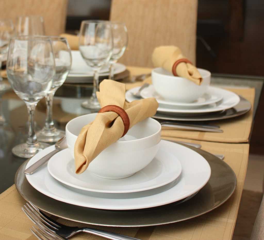 - Салфеточки должны быть размещены слева от прибора, прямо на тарелке. Допускается использование ткани для складывания столовых приборов: ножа, ложки, вилки.