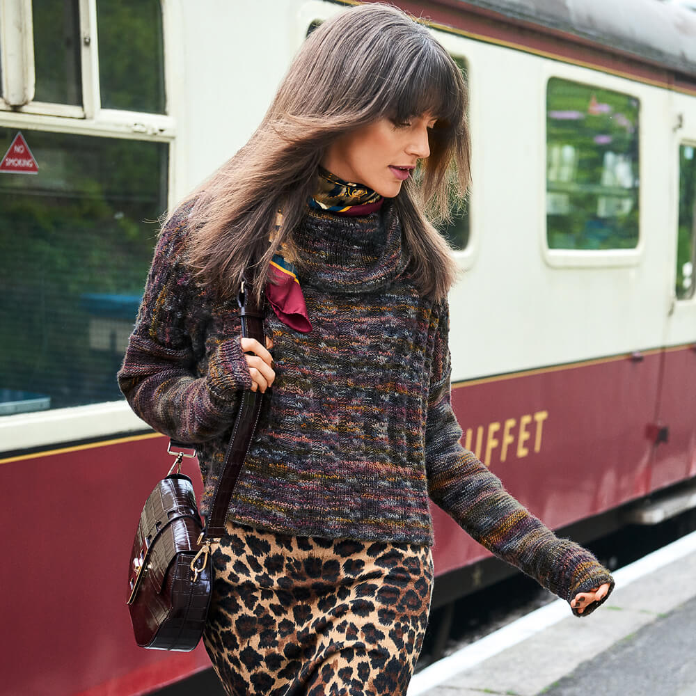 Эффектный запах спереди, длинные цельновязаные рукава, свободно лежащий вокруг шеи воротник гольф — удобный и модный свитер оверсайз понравится поклонницам нестандартных решений.