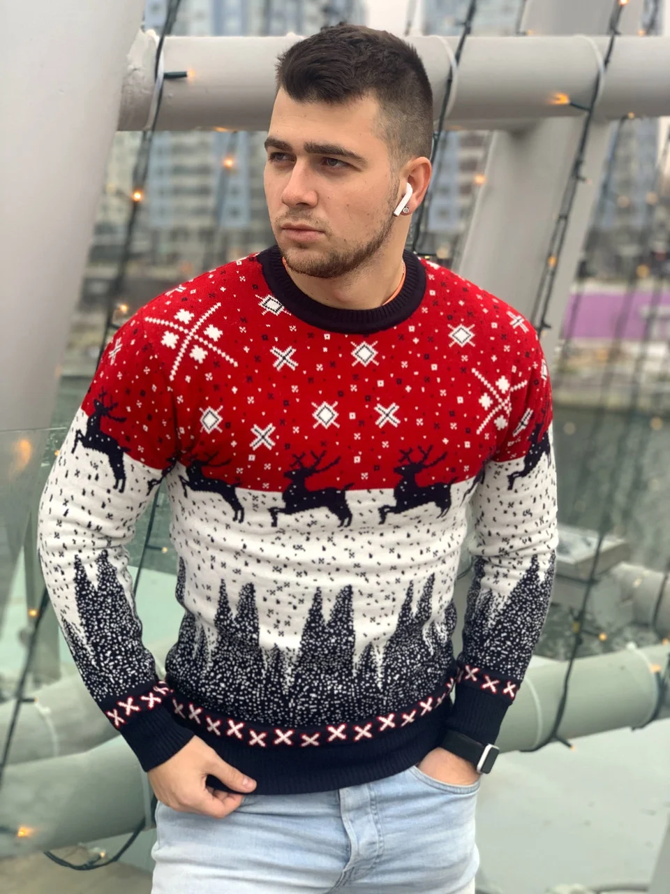 Легкий пуловер с ромбами можно надевать сверху на рубашку. Получится очень стильно, да и в случае жары мужчина сможет снять верх и остаться в элегантной одежде. Для веселого и беззаботного отдыха свяжите своему мужчине теплый свитер с оленями – он оценит ваши старания и чувство юмора. Меланжевый свитер крупной вязки с уютным капюшоном вполне впишется гардероб спортивного мужчины. Жаккардовые узоры характерны как для женского, так и для мужского образа. По этой фото схеме вы можете связать свитер и себе и своему любимому и создать гардероб в стиле family-look. О том, как мастерить женские вязаные свитера спицами мы рассказывали ранее в одной из публикаций.