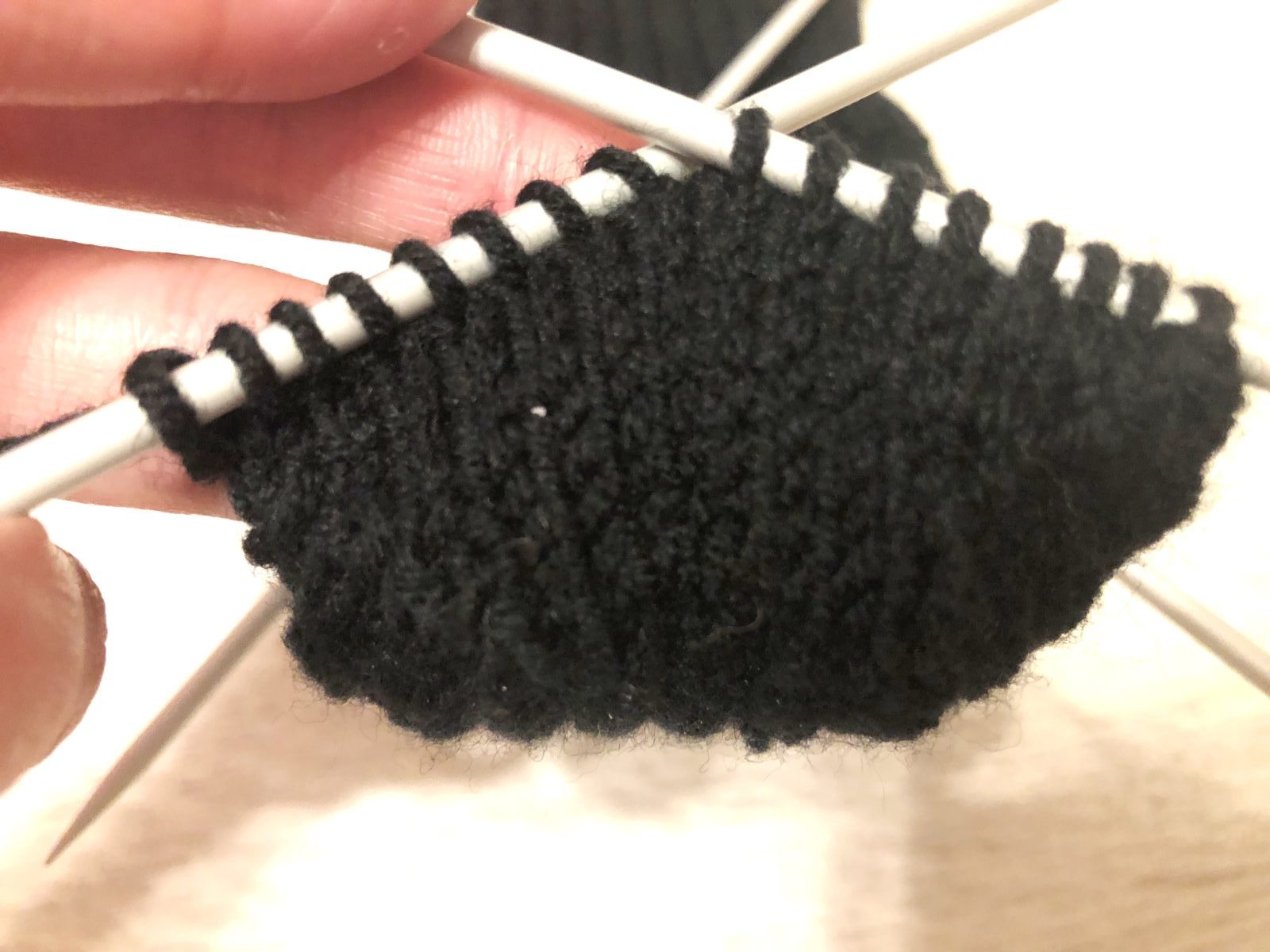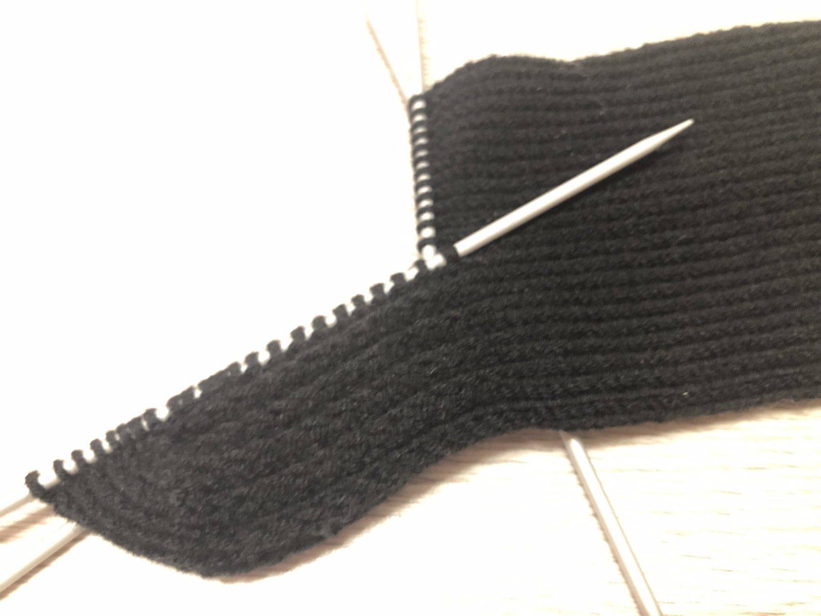Затем снова пятка. Здесь мы сначала поднимаем 14 петель, а затем на эту же спицу вяжем 8 петель пятки.