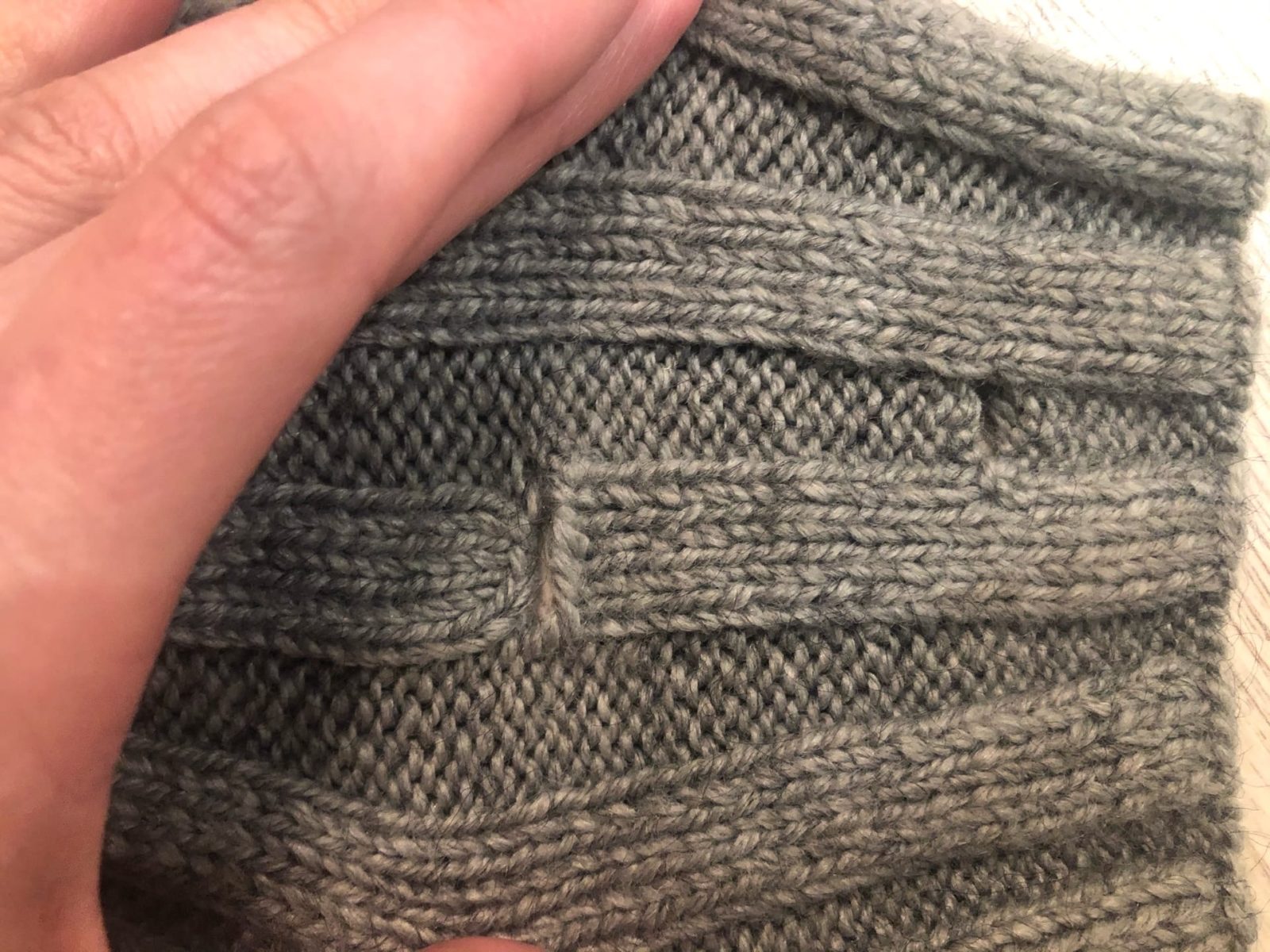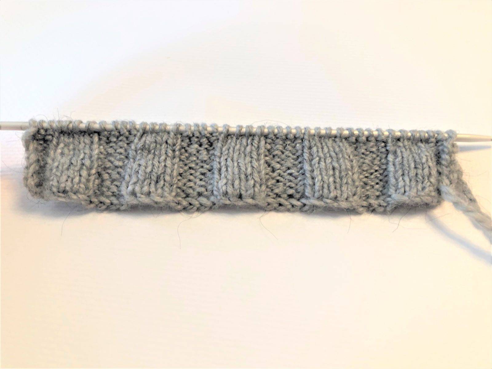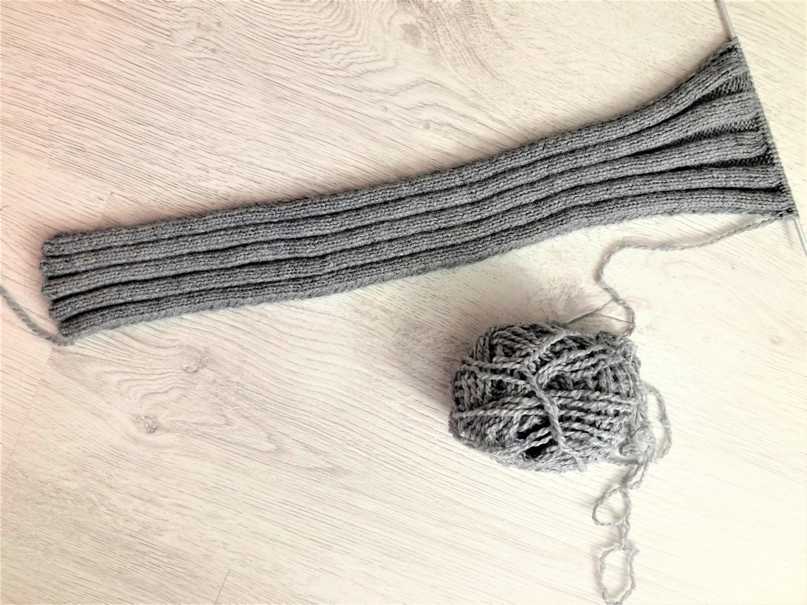 Так вяжем, пока полотно не будет составлять 26 см в длину. Последний рядок — изнаночный.