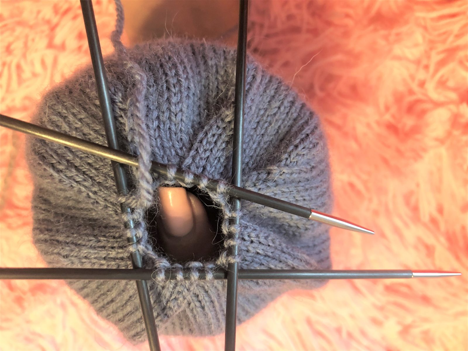 Когда будет удобно (мало петель), переходим на обоюдоострые спицы.