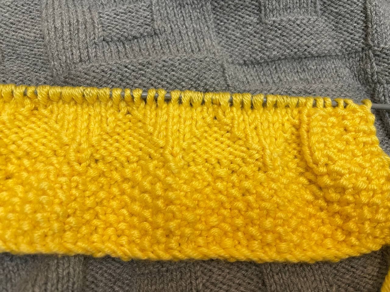 Кромочная, 4 петли путанки, 1 лицевая, 4 изн., 1 лиц., 7 изн., 1 лиц. Повторять центральный мотив (лиц., 7 изн., лиц.) нужное количество раз (в зависимости от количества набранных вами петель). Закончить 1 лиц., 4 изн., 1 лиц., 4 петли путанки, кромочная.