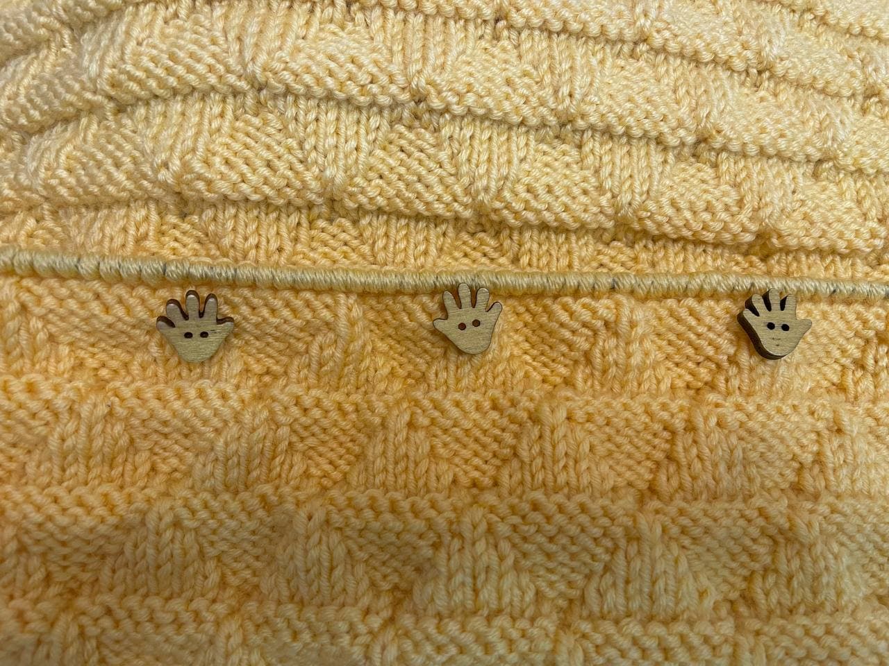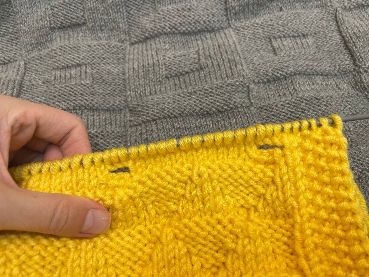 В конце вяжем ряд лицевых, ряд изнаночных (с изнаночной стороны). Далее делаем 5 разрезов для пуговиц на одинаковом расстоянии друг от друга (у меня вышло по 3 петли на одну пуговицу).