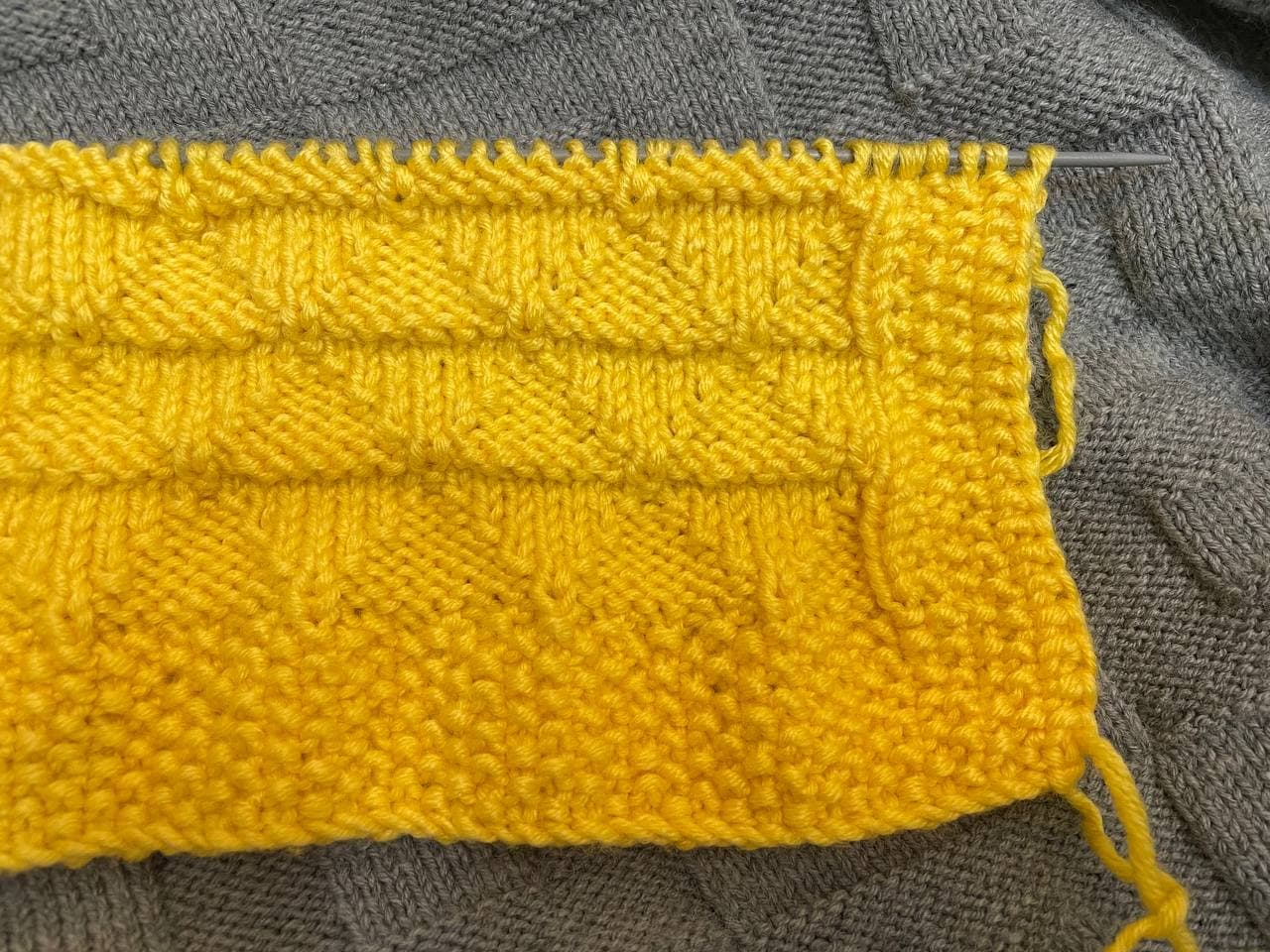 В итоге получается дорожка из 5 петель изнаночной глади и дорожка из 13 петель узора.