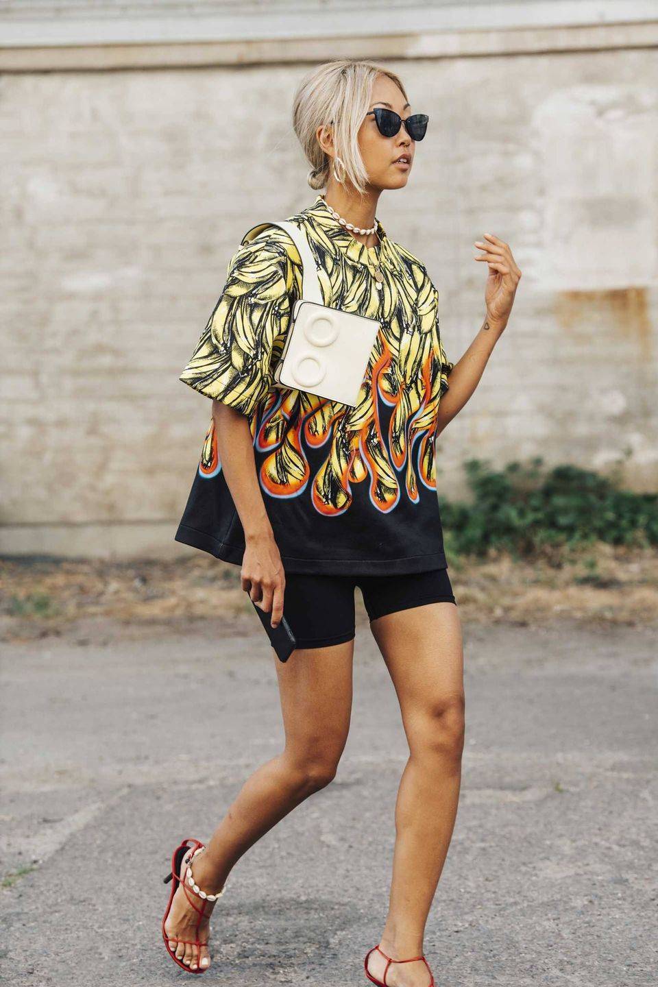 Что касается обуви, то у вас есть два варианта: сделать образ 100% спортивным с кроссовками или сломать спортивную сторону велосипедных шорт, дополнив их ботильонами или босоножками на каблуке.