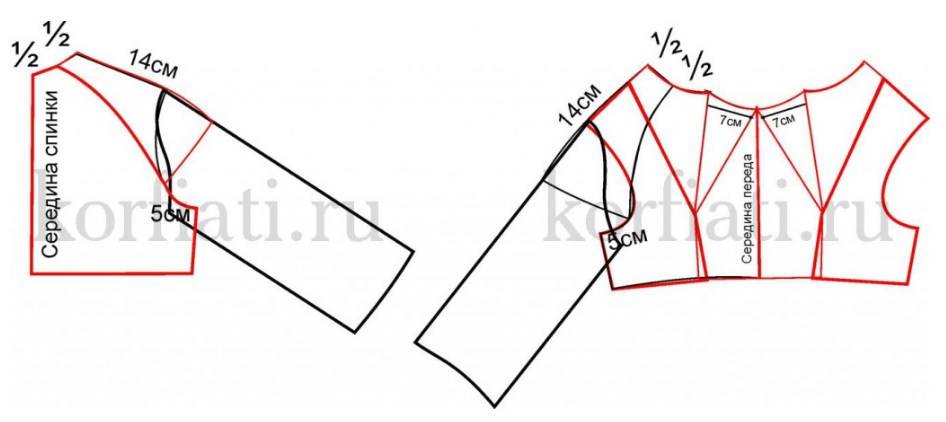 Занижаем линию плеча на переде на 5-8 см, а на спинке – на 1-1,5 см больше. Тоесть на 6-9 см или 6,5-9,5 см.