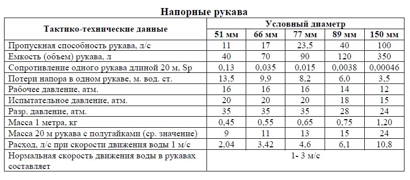 Из таблицы вы узнаете справочные данные: пропускную способность, емкость и объем рукава, сопротивление, потери напора, рабочее и испытательное давление, массу (вес), расходы и скорость движения воды.