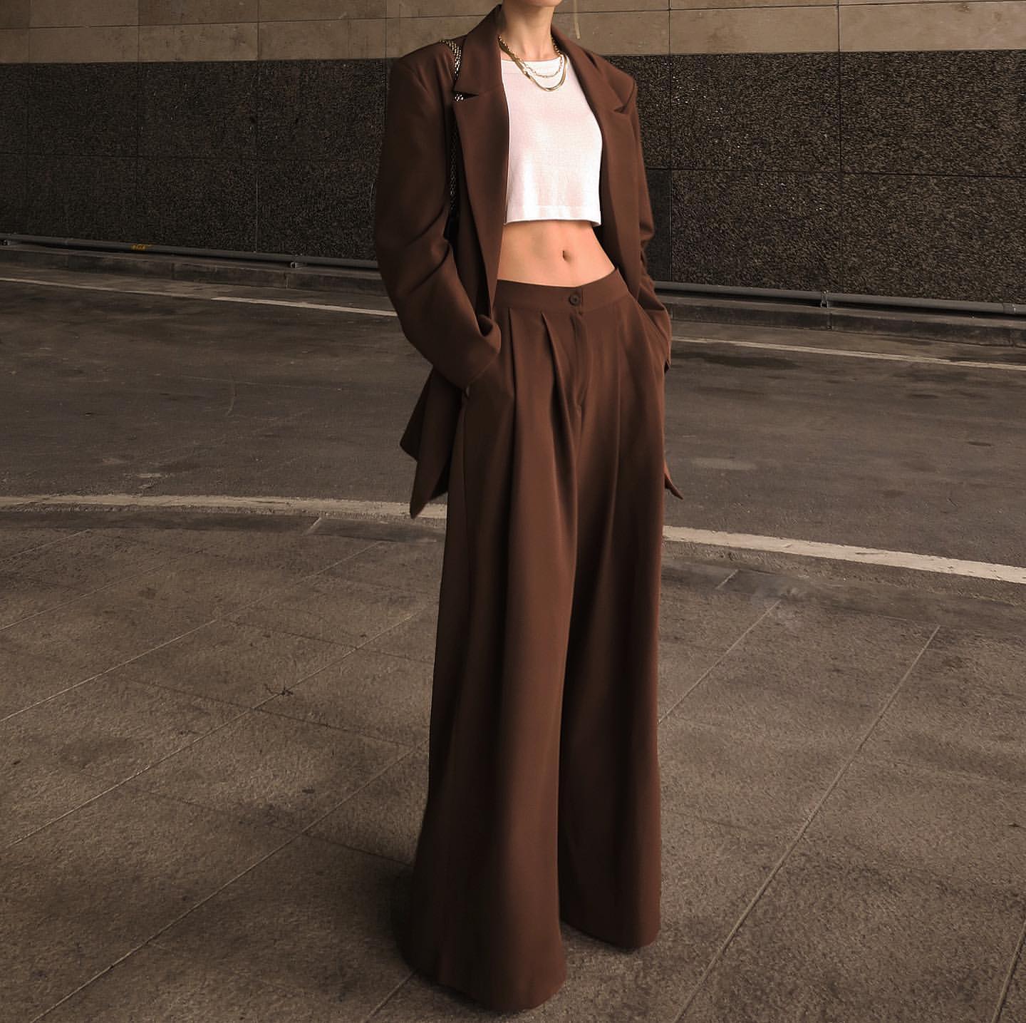 Элегантный повседневный наряд – широкие брюки, кроссовки и длинное пальто