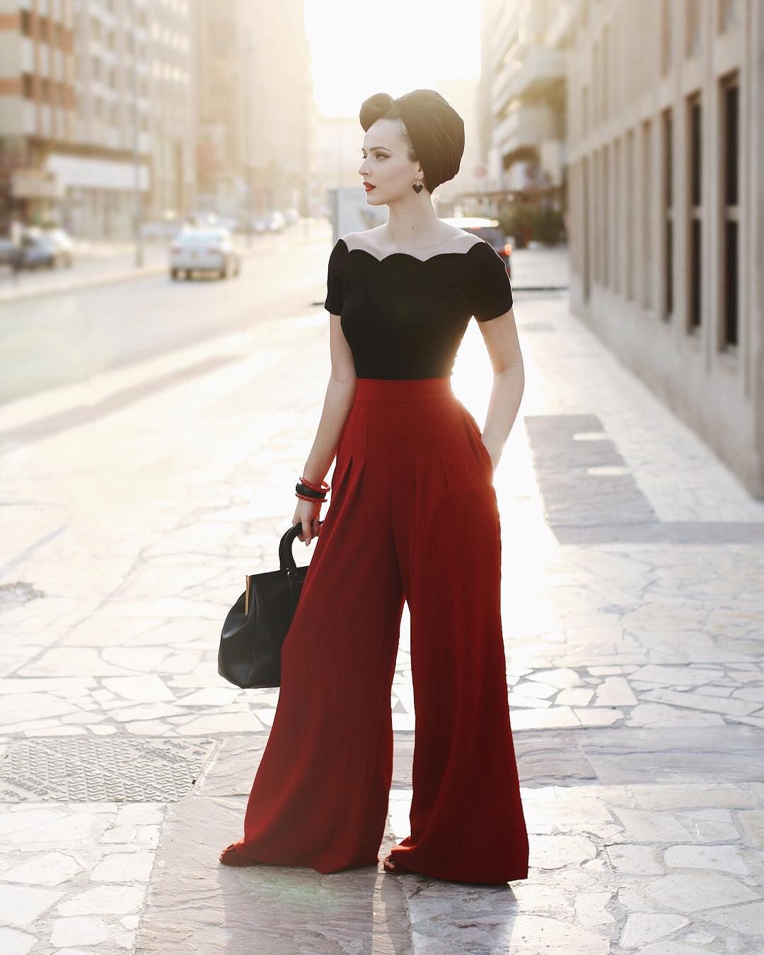 - Повязка на голову яркого, даже «агрессивного» цвета – популярный атрибут для создания сексуального ретро образа. Повязку или скрученный шейный платок на голове размещали таким образом, чтобы концы были спереди на голове и чуть свисали вниз;