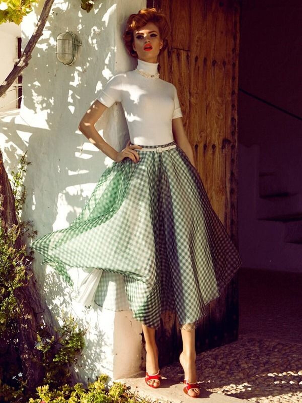 50-е. Это время считается эпохой свободы, оптимизма и веры в светлое будущее. Одежда отличается раскрепощенностью фасонов: корсеты, лифы без бретелей, туфли-шпильки и ярко-красная помада. Такой образ в винтажном стиле не для скромниц, он призывный, раскованный и смелый.