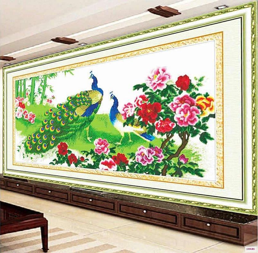 Монохромная вышивка продолжает набирать популярность. Это картины, выполненные в одном или двух цветах. Очень красиво выглядит черно-белая картина с павлином. Белые птицы на черной канве, и наоборот, придадут стиль любому помещению.