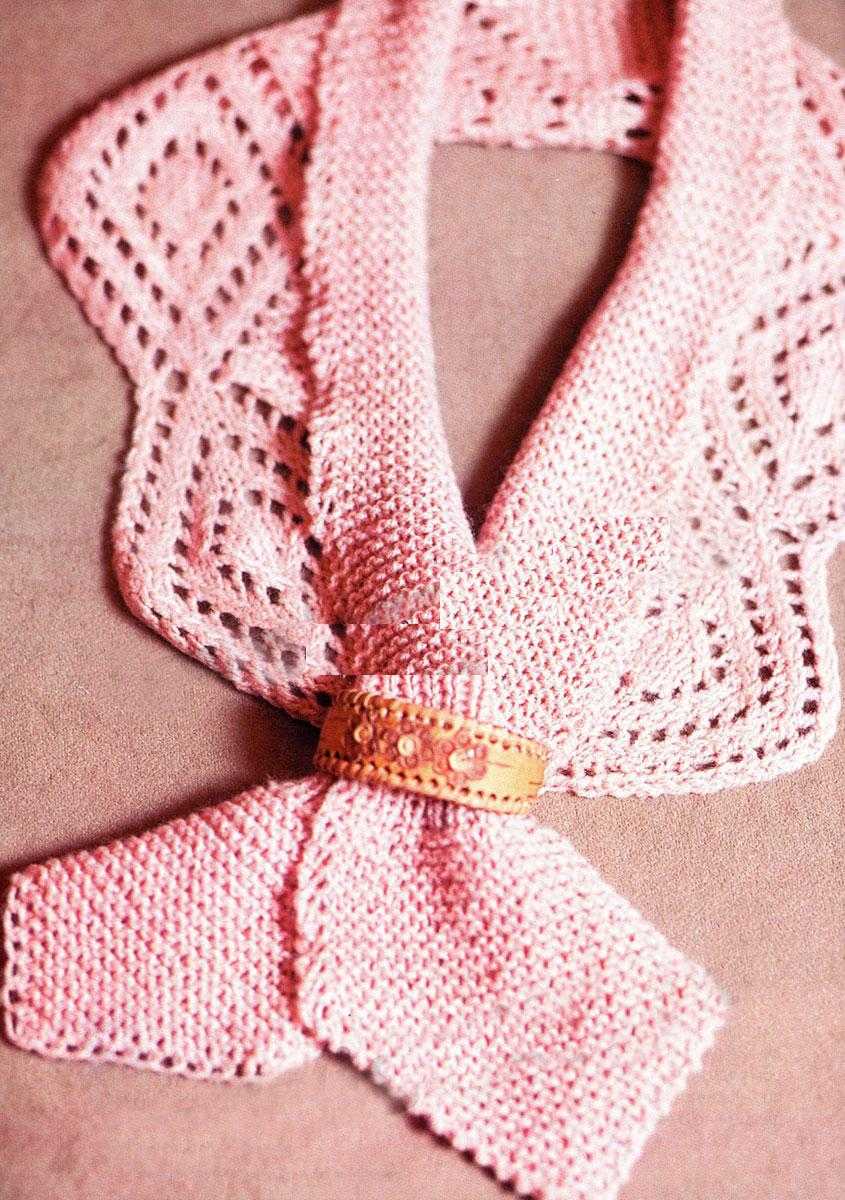 Модель первого воротника прекрасно подходит не только для взрослых, но и для детей. Чтобы его связать спицами, используйте акриловую пряжу розового цвета и спицы номер 2,5. Нужно набрать три п. и вязать платочную вязку, делая прибавки в начале, а потом в конце каждой полосы по одной штучке до тех пор, пока на спицах у вас не получится тридцать петлиц. После этого двадцать рядов необходимо вязать платоч. вязкой по прямой. Дальше выполните еще двадцать р. резинкой один на один по такой схеме: 18 звеньев вяжутся резинкой один на один, две п. закрываются, а остальные п. выполняются также резинкой 1 на 1.
