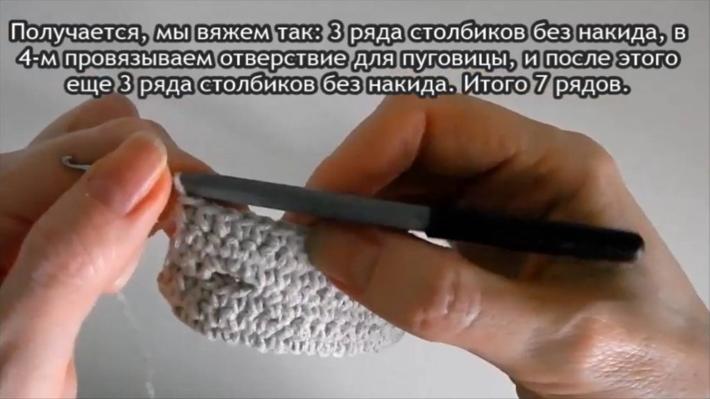 1-й ряд: 1 ВПП, и в каждую пет. весь ряд вязать столбиками без накидов (СБН), в конце ряда – 1 ВПП. (См. схему 1).2-й ряд: поворот детали, снова 1 ВПП, 1 СБН – до конца ряда, 1 ВПП, поворот.3-й р: 1 ВПП, весь ряд – СБН, 1 ПП, поворот.4-й р: 2 СБН, формируем отверстие: 3 ВП, пропустить 3 петли и в 4-ю пет. – СБН, и снова СБН в каждую пет.5-й р: 1 ВПП, СБН до того места, где у нас 3 ВП для пуговицы: в эти 3 ВП провязать по 1 СБН (как в 1-ом ряду) и еще 2 СБН.6-й и 7-й р: все ряды – СБН.