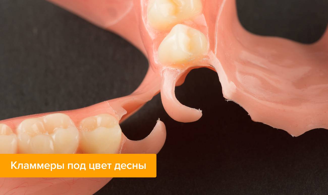 Для установки нейлоновой съемной конструкции не требуется обтачивать соседние зубы. К зубам она крепится при помощи дентоальвеолярных кламмеров (замочков или крючков) из того же нейлона, которые являются естественным продолжением протеза и незаметны при улыбке и разговоре. Это позволяет осуществлять протезирование в наиболее трудных с эстетической точки зрения участках челюсти.
