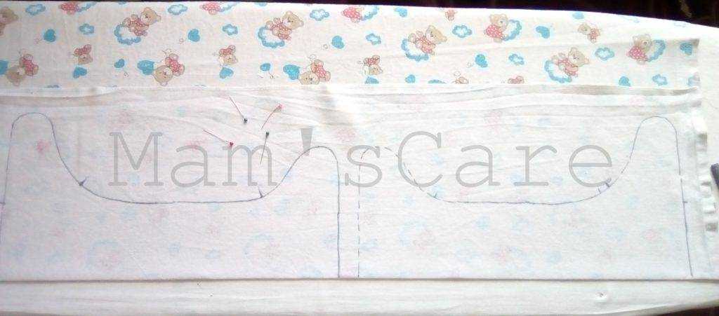 Выкройка детского боди берется из интернета, для простоты работы. При переводе лекала на ткань, нужно делать припуски около 2 см. Для обводки лучше использовать мыло или текстильный маркер.