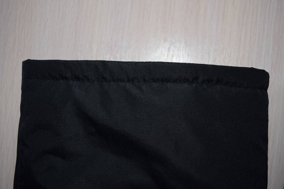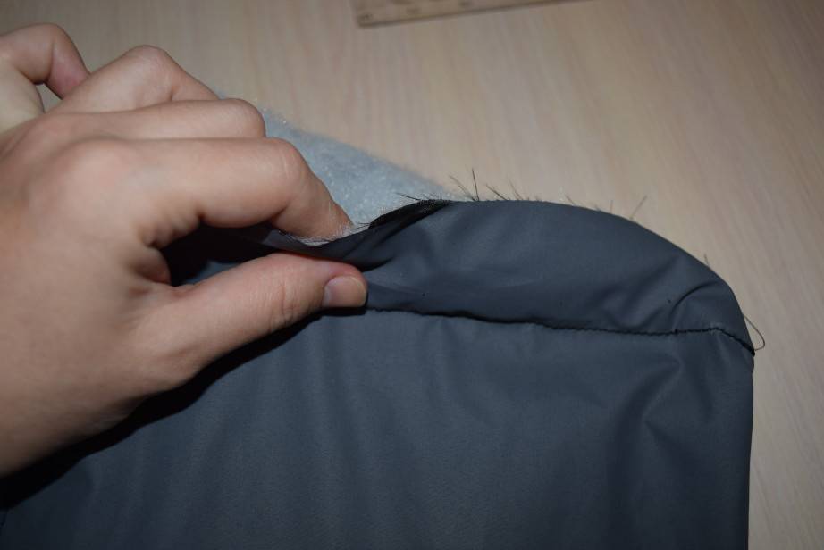 Теперь я соединяю синтетические брюки и пальто по нижнему шву брюк. Для этого я укладываю их изнаночной стороной друг к другу, при этом каждая деталь (утеплитель и плащ) лежит на одной стороне — лицевой или изнаночной.
