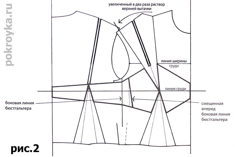 Также корректируется участок верхней линии бюстгальтера между боковой линией и верхней вытачкой (область подмышки), его необходимо слегка прогнуть (на 0,5 см).