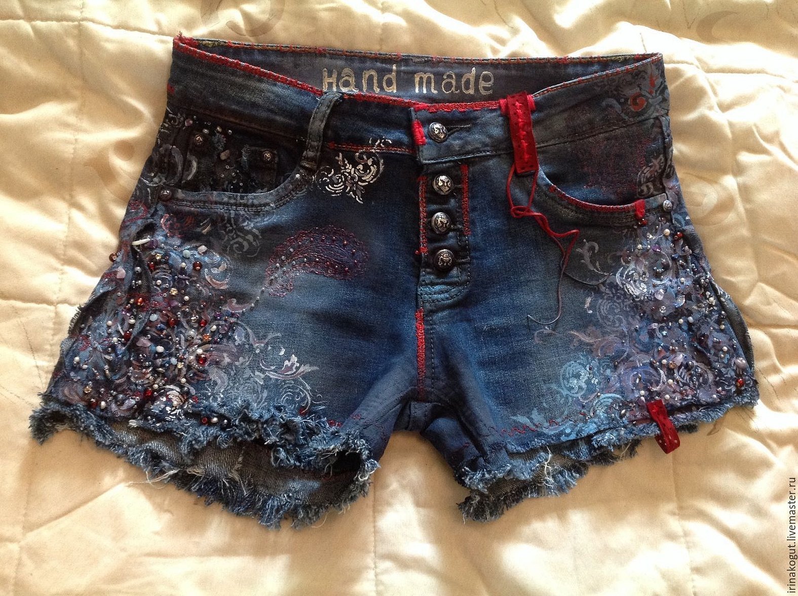 Готовые шорты осталось только чем-то украсить, поэтому я решила нарисовать на них рисунок акриловыми красками по ткани. Но так как ткань не очень плотная, я подкладывала под штанину полотенце, чтоб акриловые краски не отпечатались на задней части шорт. Если с рисованием у вас совсем туго, то можно скачать контуры аппликации любого рисунка и просто перевести их на изделие.