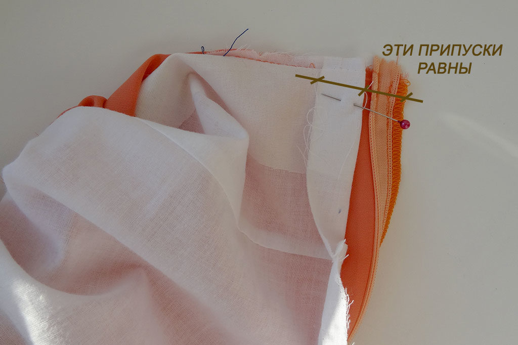 Совмещаем краешки подкладки юбочки с краями подкладки лифа, скалываем.