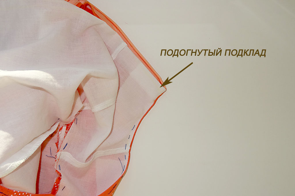 Соединяем подкладку и верх платьица по проймам и горловинке.
