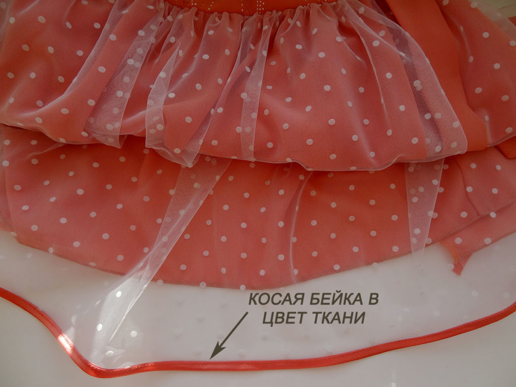 Низ юбки обработаем из сетки косой бейкой под цвет платья. Для этого бейку сложите пополам по длине, вставьте край платья между слоями и измените край на 1 мм от края. Следим за тем, чтобы нижний слой бейки также был захвачен швами.