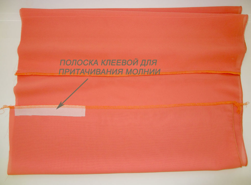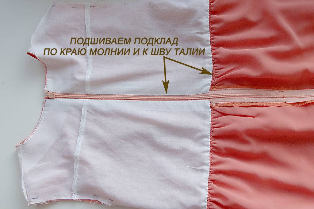 Края подкладки складываем наизнанку, размечаем на молнии и закрываем шов по линии талии.