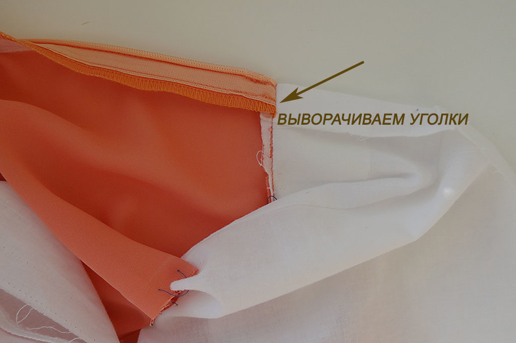 Берём две заготовки из органзы, складываем их лицевыми сторонами внутрь, скалываем, стачиваем, обрабатываем шов оверлоком.