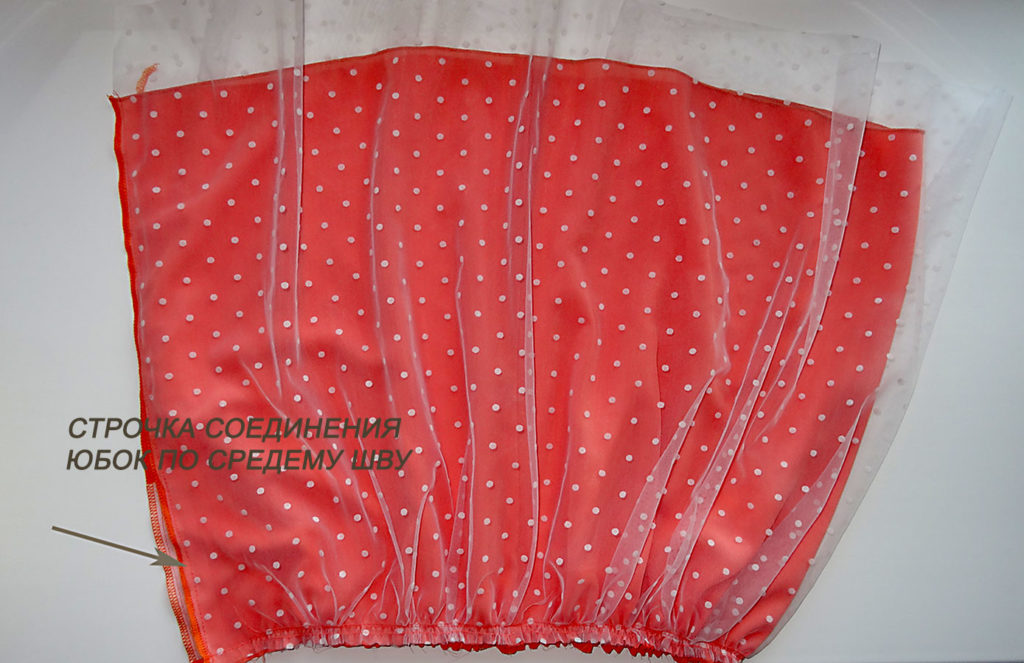 Равномерно распределяем складочки на фатине и притачиваем его к изнаночной стороне юбочки подкладки, от верхнего среза отступаем на 3-3,5 сантиметра.