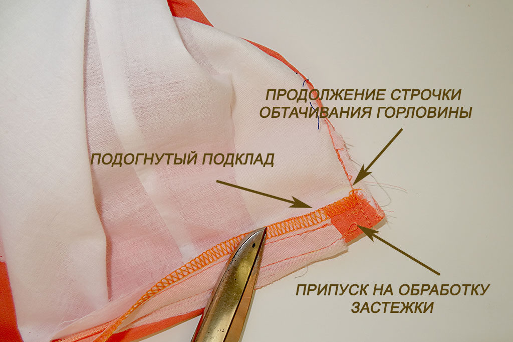 Поверх вагонки положить запас для обработки застежки. Шовным швом расширяем шов так, чтобы вырез горловины загибался вверх до складки.