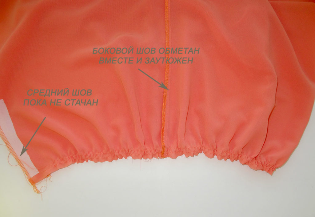 - Срезаем лишнюю ткань, обрабатываем верх, получив кулиску. Повторяем то же самое с рукавами, вставляем в них резинку.