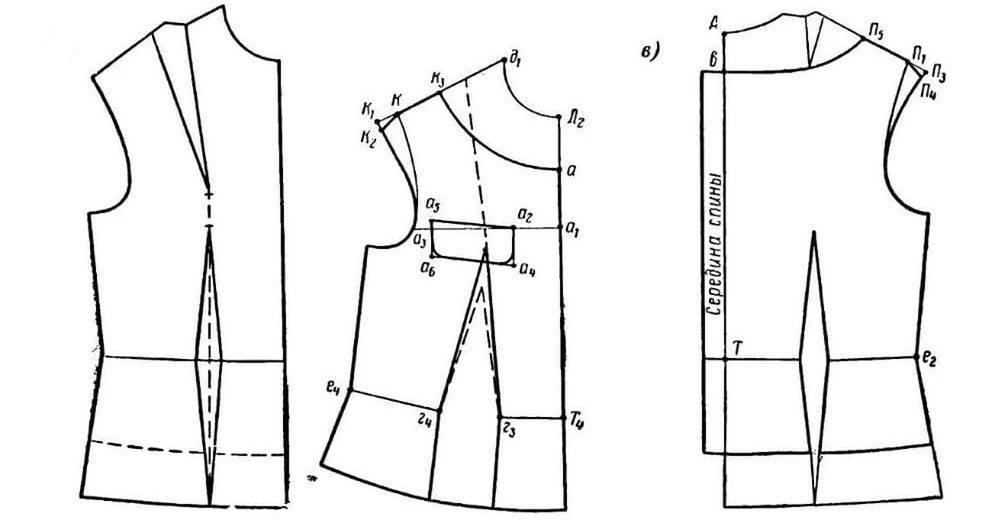По талии откладываем от середины спины 1 см и проводим перпендикулярную прямую к линии низа. Вверх проводим лекальную кривую, соединяя точку на талии с точкой в центре отрезка между низом горловины и линией проймы.