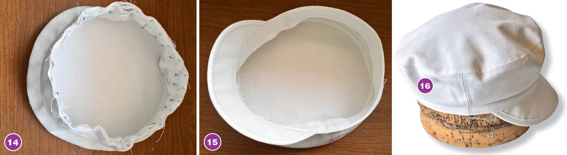5. Соединяем подготовленный околыш с козырьком и верхнюю часть изделия между собой, равномерно посаживая срезы стенки картуза по всей длине (посадка нужна для придания верхней части картуза необходимого объема) (14-16).