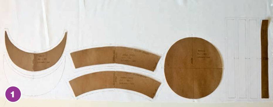 3. Обработаем козырек. Напомним, что верхний и нижний козырьки выкраиваются без припусков на шов по внешнему срезу. По внутренним срезам деталей козырька припуски шва (= срезы, которые соединяются с околышем) составляют 1 см. Вкладыш козырька выкраивается без припусков на швы по всем срезам.