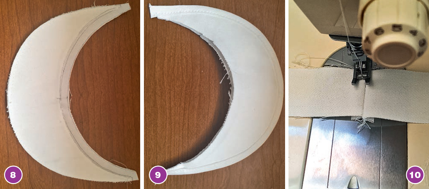 4. Соединяем боковые срезы околыша и подкладки околыша, расстрачиваем швы (10).
