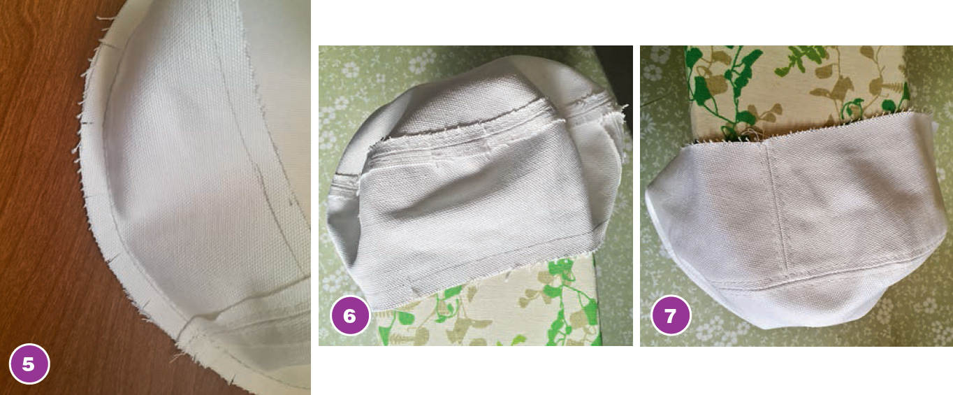 Обрабатываем подкладку картуза (18): соединяем боковые срезы подкладки стенок стачным швом вразутюжку. Притачиваем подкладку стенок к подкладке донышка, шов заутюживаем на подкладку стенок.