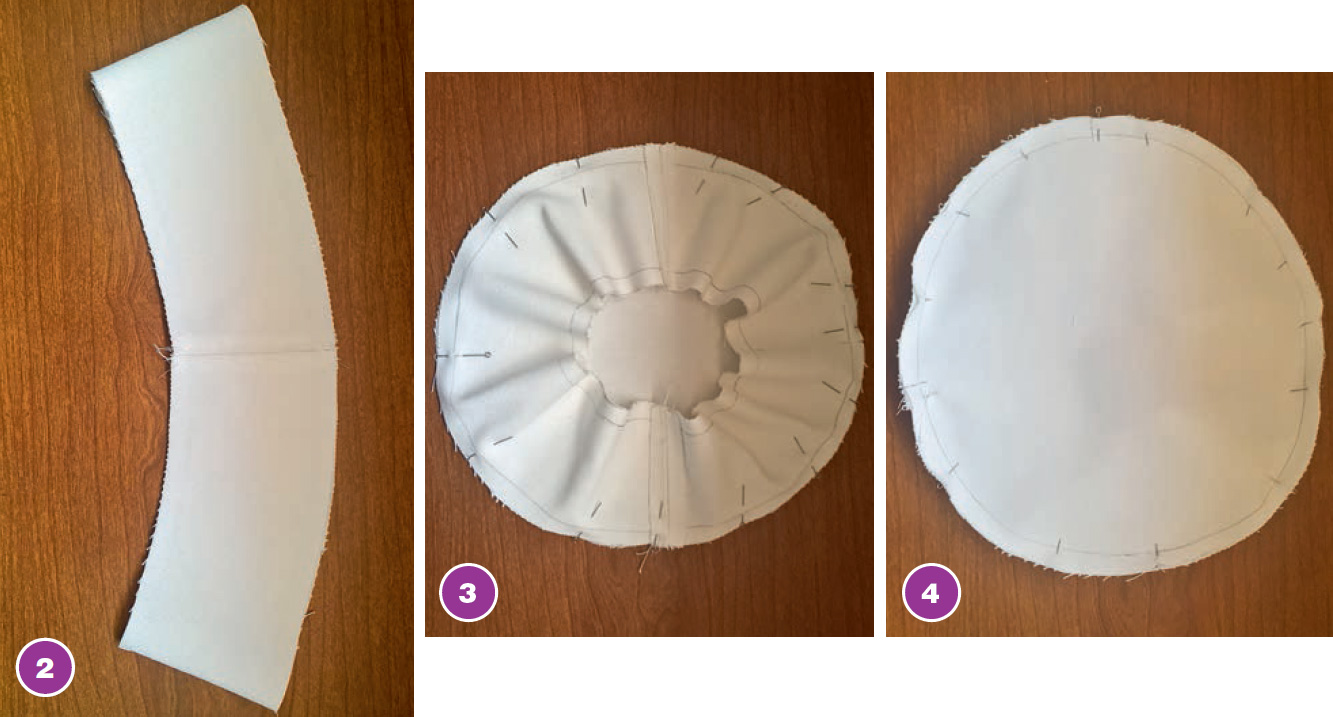 2. Складываем донышко картуза и стенки лицевыми сторонами внутрь, совмещаем срезы и средние линии деталей; скалываем булавками (3, 4).